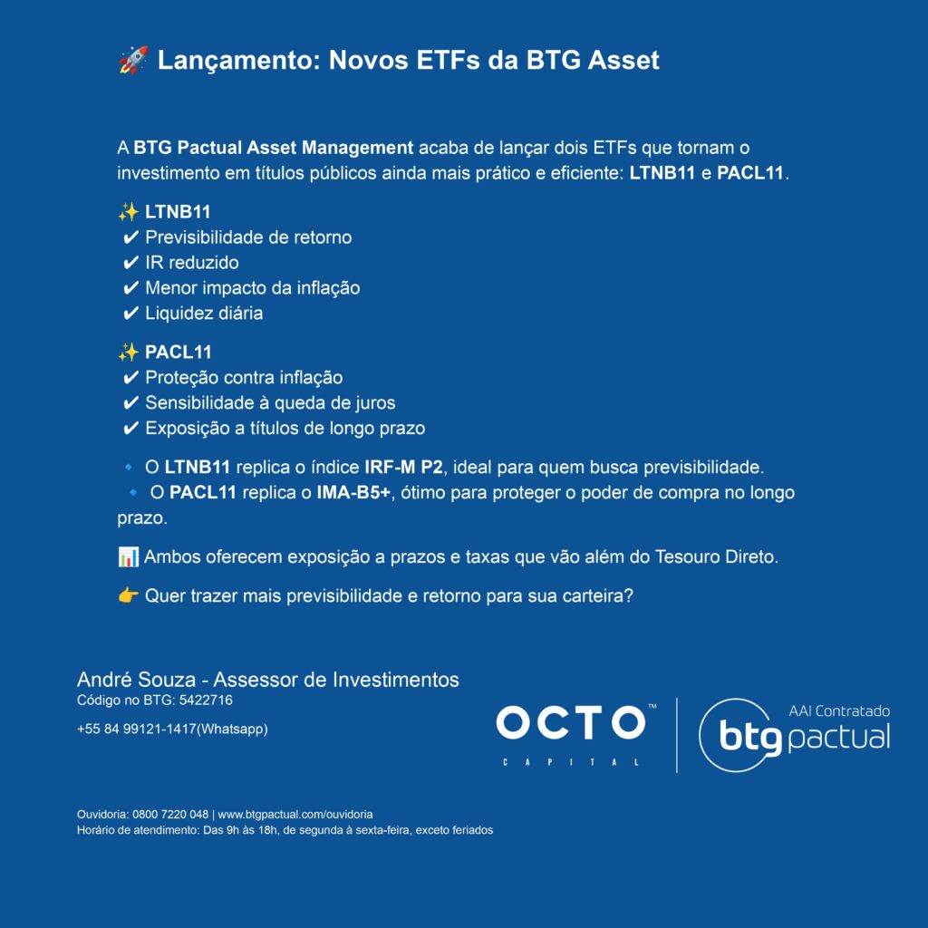 Os novos ETFs da BTG Asset chegam como alternativas interessantes dentro da renda fixa. O investidor que busca previsibilidade pode encontrar no LTNB11 uma solução eficiente. Já quem deseja proteger seu patrimônio da inflação e aproveitar oportunidades em títulos de longo prazo pode se beneficiar do PACL11.